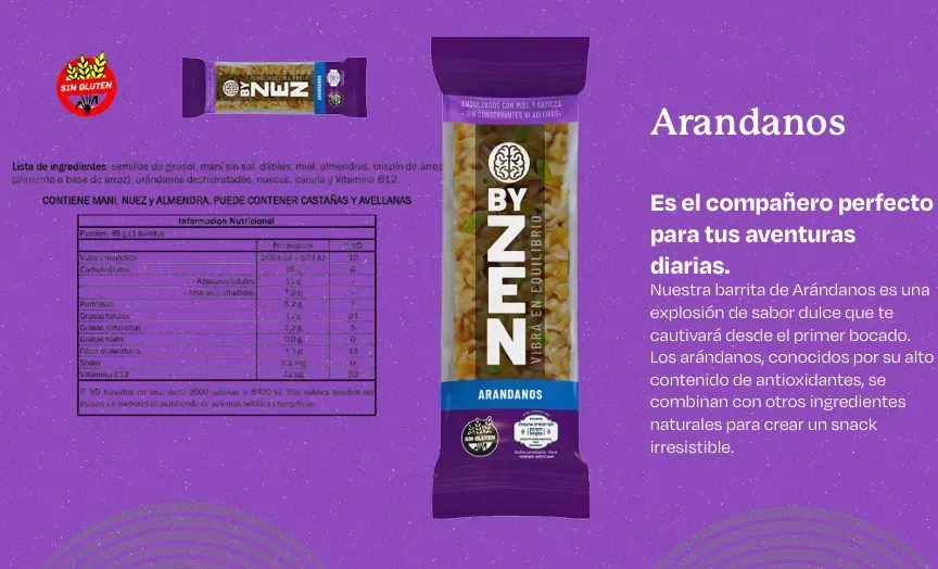 Disfruta del delicioso snack bar llamado By Zen, perfecto para satisfacer tus antojos en cualquier momento del día. Con su mezcla única de sabores y texturas, este tentempié te brindará una experiencia de sabor inigualable. ¡No esperes más para probarlo!
