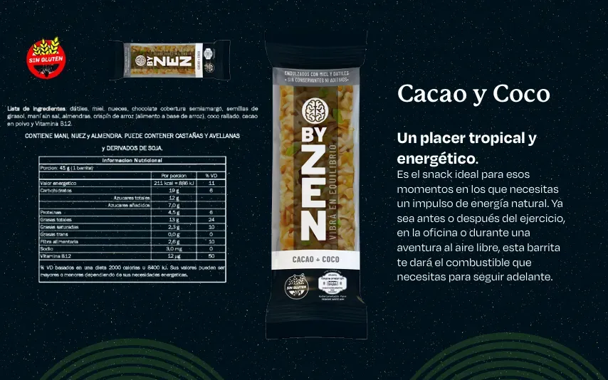 Disfruta de la deliciosa combinación de cacao y coco con las barritas energéticas BY ZEN. Cada caja contiene 12 unidades de 45 gramos cada una, perfectas para llevar contigo a donde vayas. Energía natural y sabor exquisito en cada bocado.